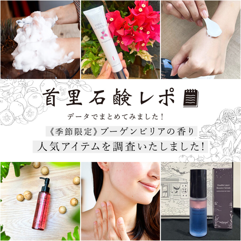 毎年大人気のブーゲンビリアの香りですが、今年は首里石鹸の代表的なアイテム「エッセンスハンドクリーム」と「ホワイトマリンクレイ洗顔石鹸」が店舗でもオンラインショップでも1位・2位にランクインしました✨