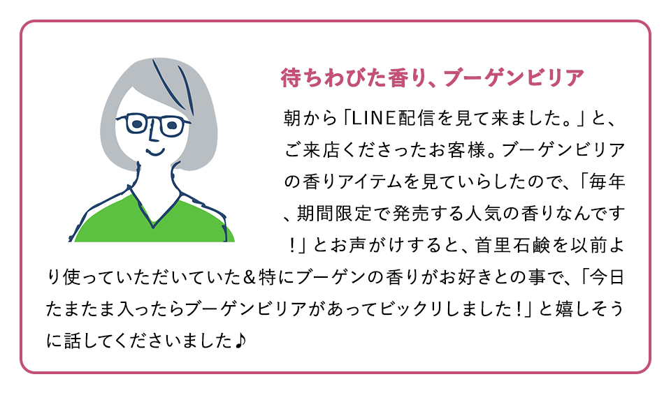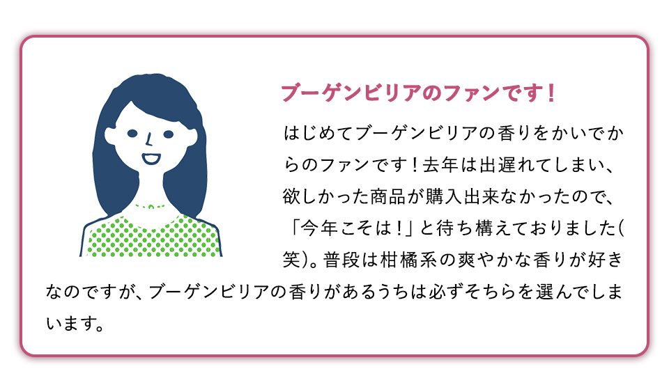 毎年大人気の香りですが、今年はどのアイテムが人気なのか、店舗・オンラインショップそれぞれの人気ランキングと共にお伝えいたします。さらに!ブーゲンビリアの香りを楽しみにされていた皆様からの嬉しいお声もご紹介させていただきます!