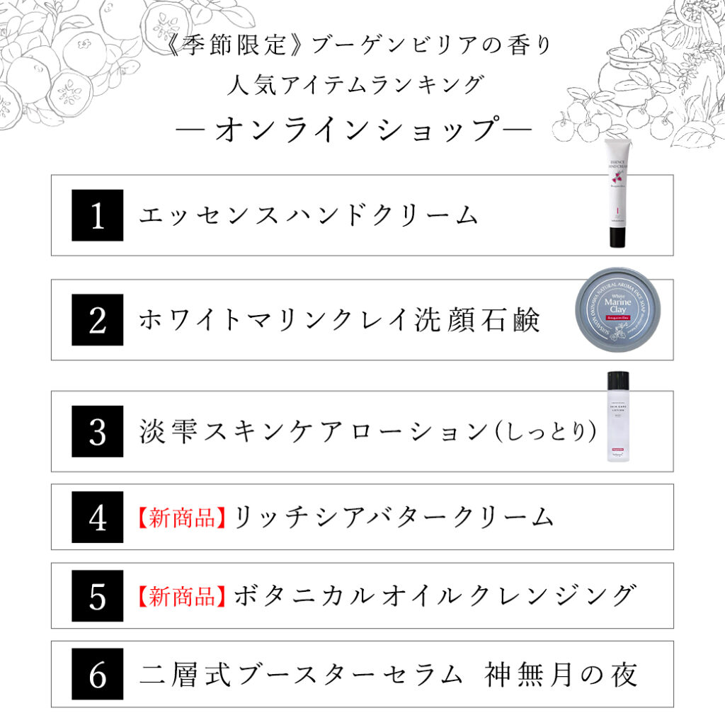 毎年大人気のブーゲンビリアの香りですが、今年は首里石鹸の代表的なアイテム「エッセンスハンドクリーム」と「ホワイトマリンクレイ洗顔石鹸」が店舗でもオンラインショップでも1位・2位にランクインしました✨