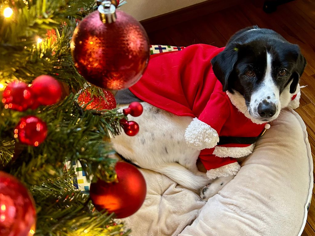 ツリーのそばにちょこんと座る愛犬を見ると、