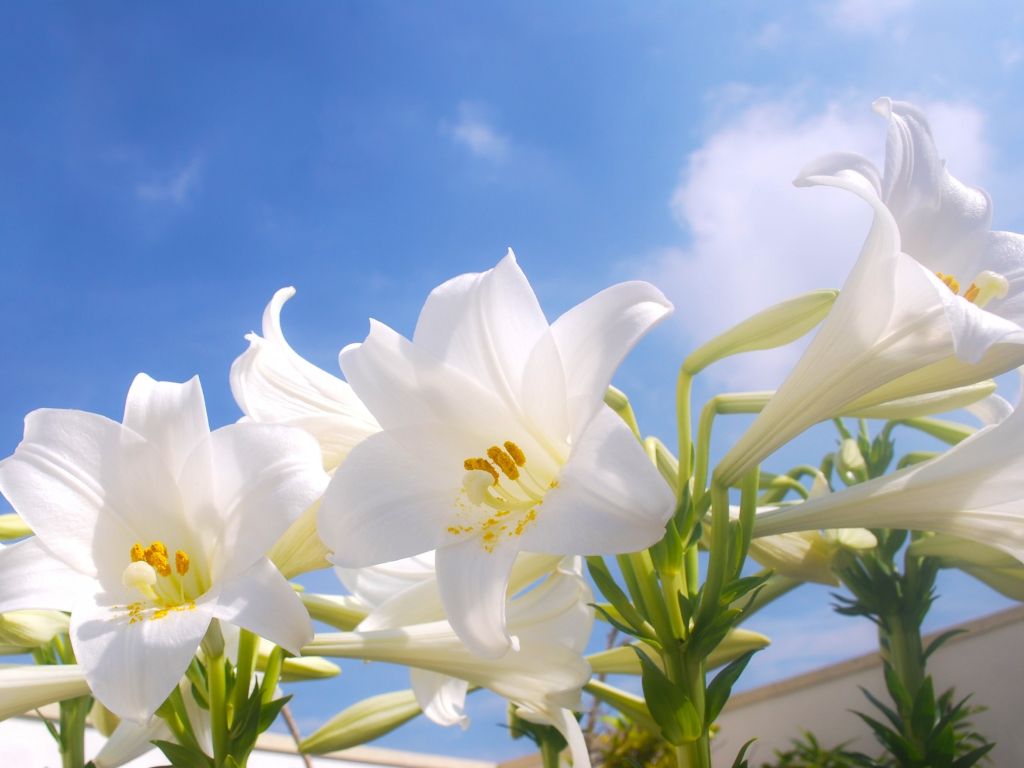 琉球ユリは「テッポウユリ」とも呼ばれ、主に九州から沖縄に自生する、日本固有の原種ユリのひとつです。純白で清楚な花を咲かせ、初夏が見頃。爽やかな青空の下で甘く優しい香りを漂わせます。
