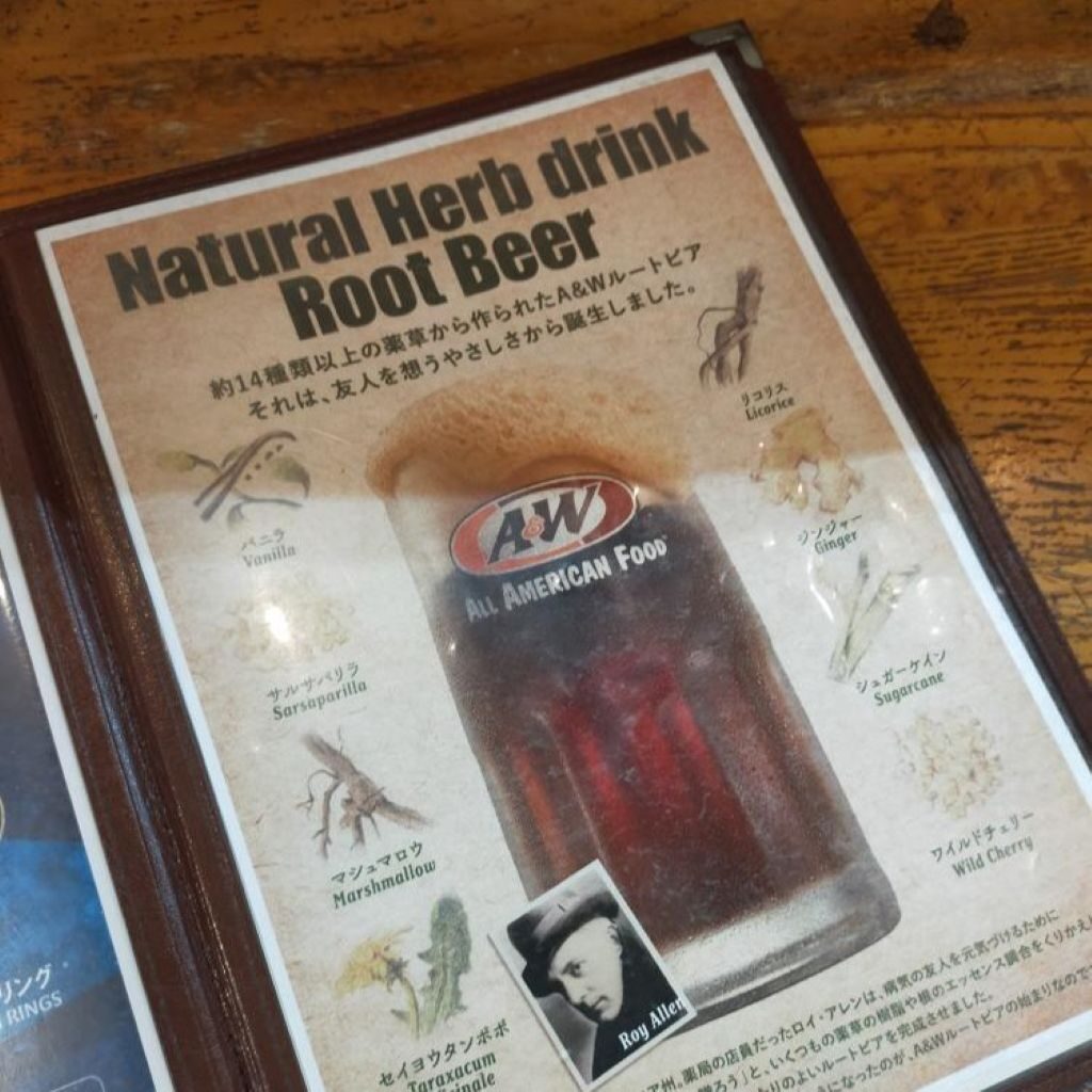 セイヨウタンポポやリコリスなど約14種以上のハーブがブレンドされており、創業者のロイ・アレン氏が病気の友人を想い開発したのがルートビアであり、A&Wの始まりでもあるそう。
