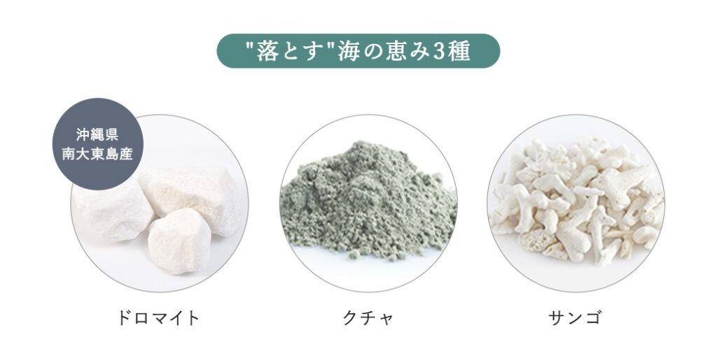 沖縄の海の恵み、「ドロマイト」「クチャ」「サンゴ」が不要な皮脂や角質、毛穴汚れまでしっかりとおとします。