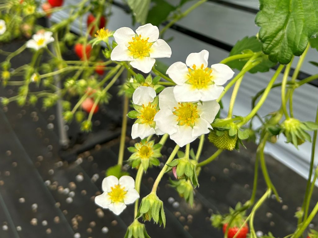 イチゴを食べ満足したら、次はイチゴの花を鑑賞して楽しむ。イチゴのかわいらしい白い花が生き生きと咲き誇っている。