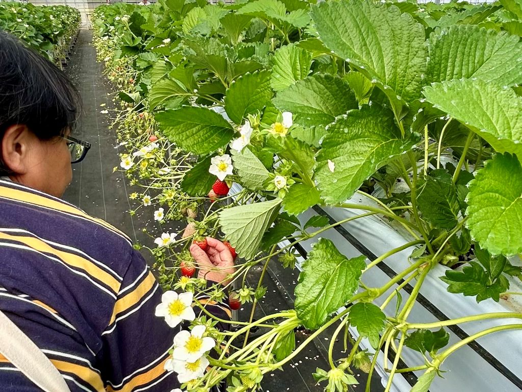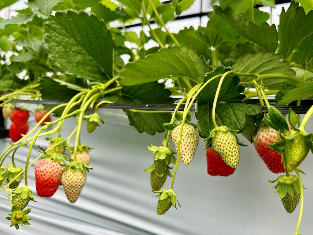 それだけではなく、ハウスの中には真っ赤なイチゴがたわわに実って垂れさがり、ハウスの奥まで続いている。
