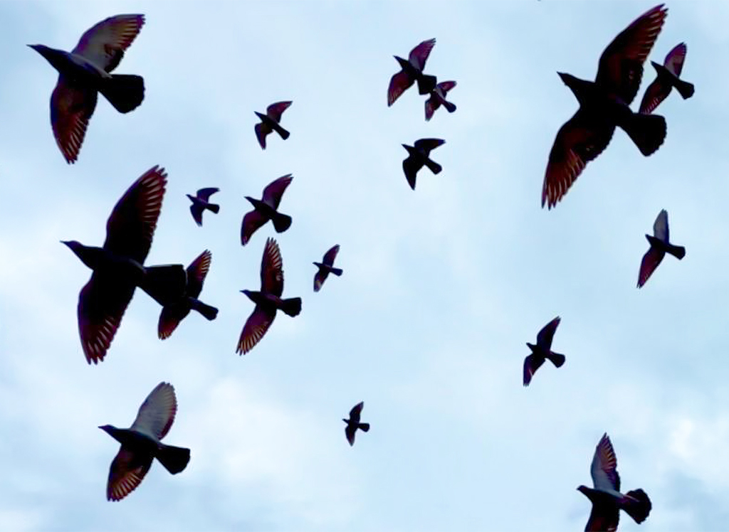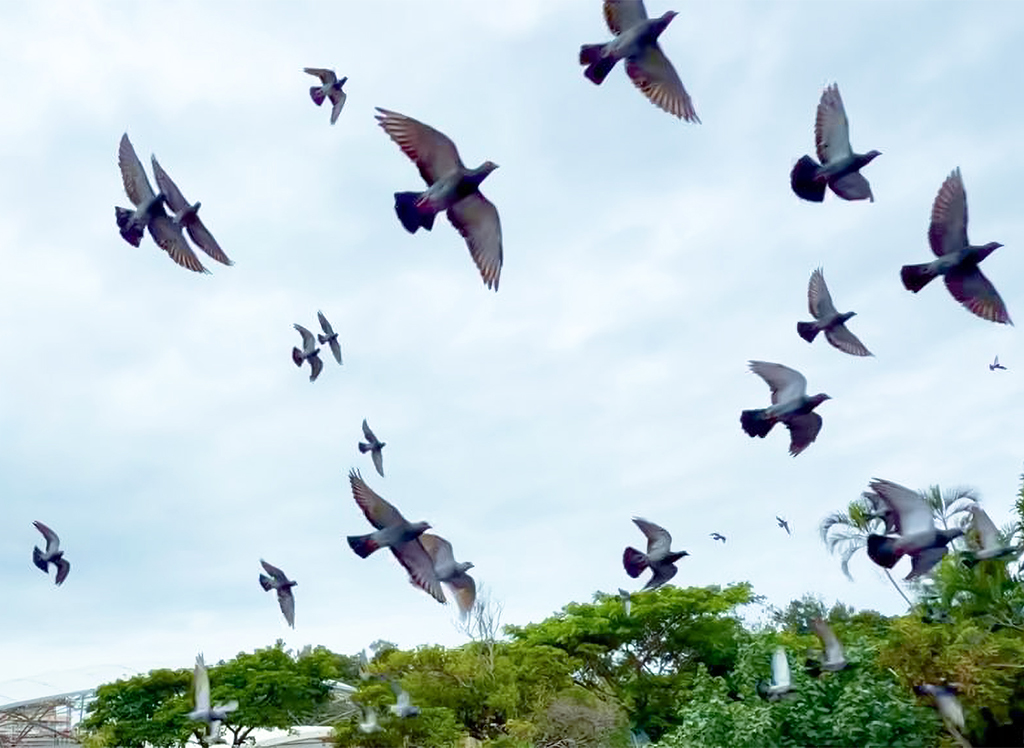 つい先ほど飛んで行った米軍機の記憶も薄れるほど、飛翔する鳩が抑揚をつけて間近から空いっぱいに行き来する様子が圧巻で、二人で顔を見合わせて、何度も拍手を送り合った!