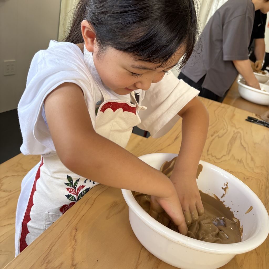 ワークショップでは沖縄の赤瓦に使われるような鮮やかなオレンジっぽい土と、やちむんの原料になる黄土色の土の2色から選んで、洗面器に入った泥の中で布をモミモミ。