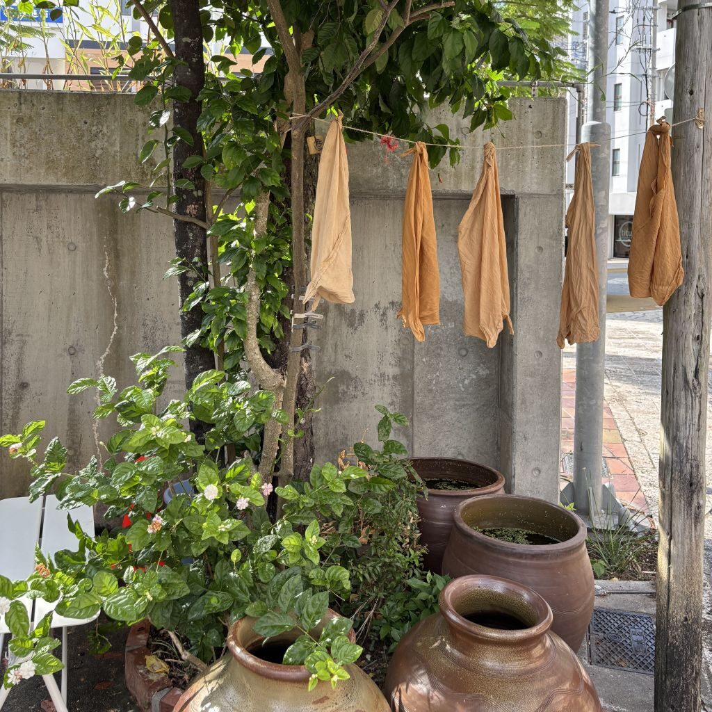キレイな「土」色に染まった布は、沖縄の気持ちいい晴空の下でゆらゆらと干されている。