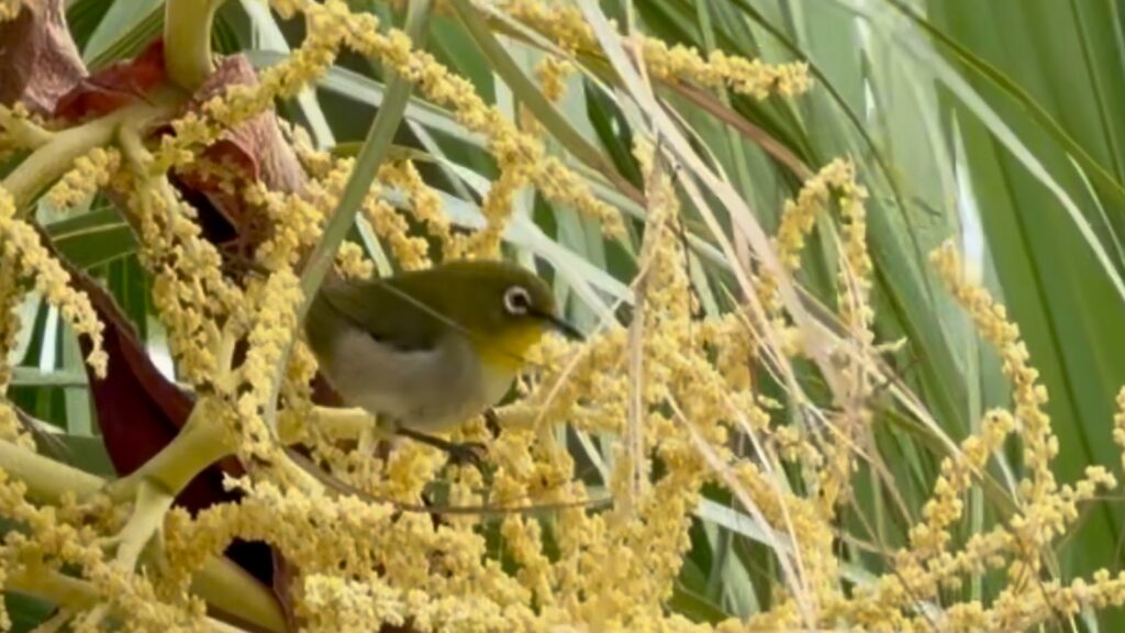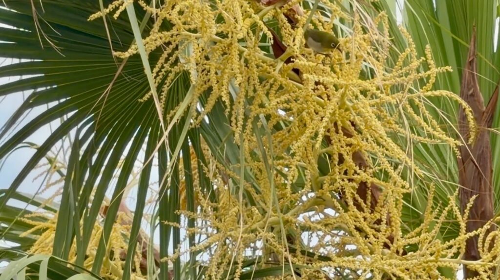 ヤシ科の『ビロウ』(沖縄では『クバ』という)の花に、メジロが止まっていた。